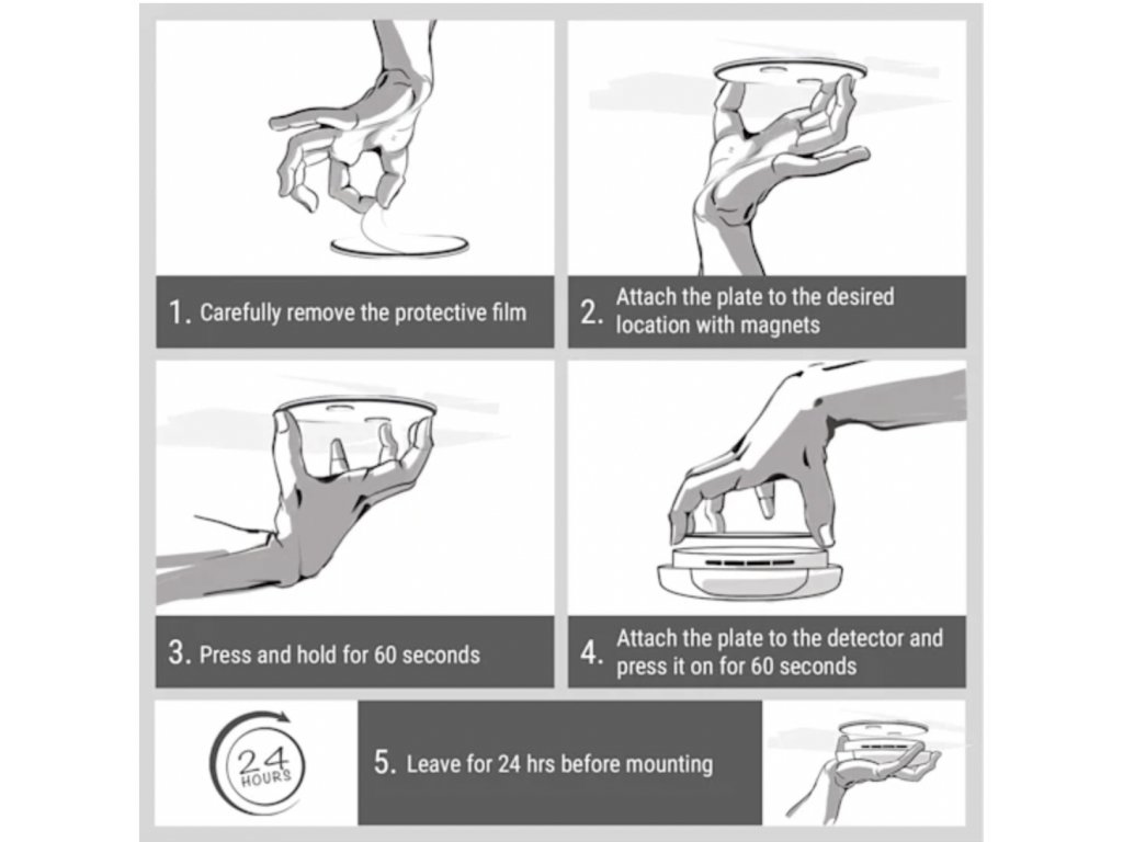 Samolepící magnetický držák pro požární hlásiče, detektory CO apod. Nemusíte vrtat do zdi/stropu (nemusíte zašroubovat ani jeden šroub ani do zdi, ani do detektoru/čidla), pouze přilepíte jednu část na strop a druhou část na hlásič. Obě části spolu drží pomocí integrovaných magnetů.
