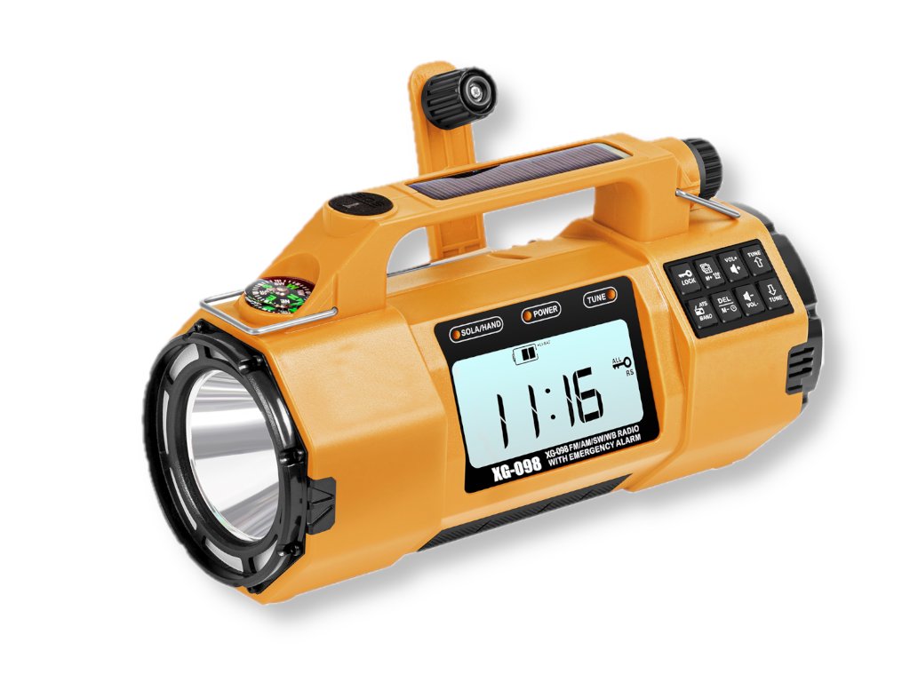 Odolné digitální rádio s výměnnými Li-ion bateriemi 2× 18650, funkcí powerbanky (5 000 mAh), výkonnou LED svítilnou (3 režimy) a SOS sirénou. Lze dobíjet přes USB-C, solární panel nebo ruční klikou. Rádio přijímá FM/AM/SW/WB včetně krátkých vln až do 30 MHz. Disponuje 5W reproduktorem, sluchátkovým výstupem (3,5 mm jack), teleskopickou anténou 45 cm a krytím IP53.