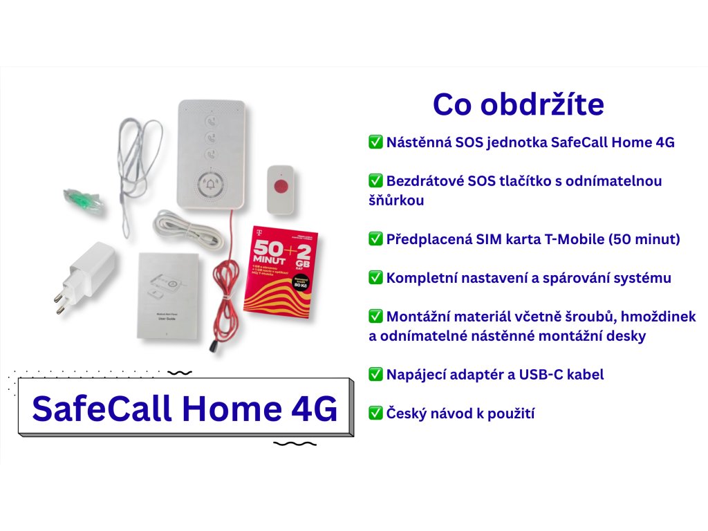 SafeCall Home 4G je primárně nástěnný SOS systém, který komunikuje přímo přes mobilní síť 4G. Kontakty a základní nastavení jsou připraveny již před odesláním objednávky, takže není nutné nic složitě programovat ani používat mobilní aplikaci.